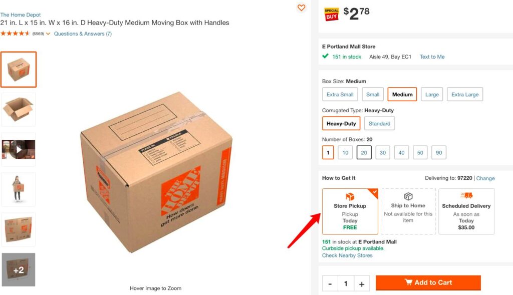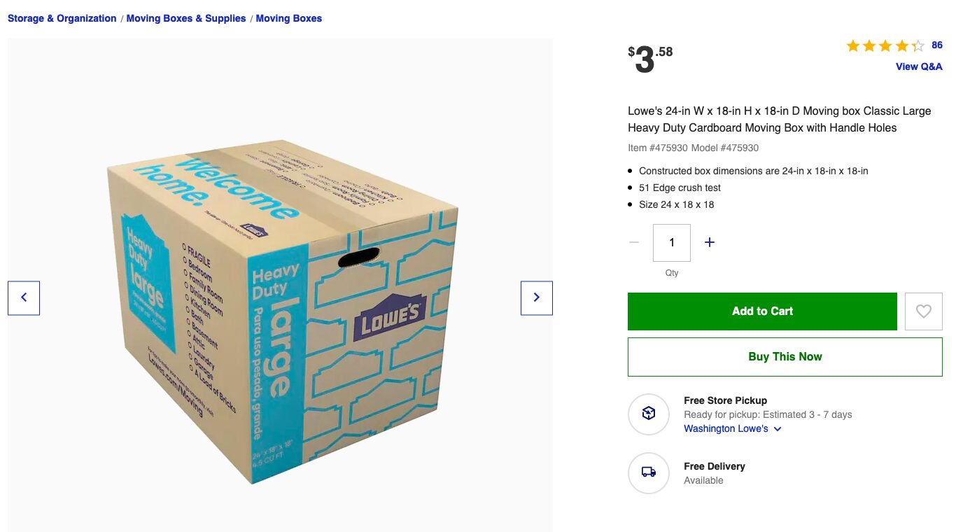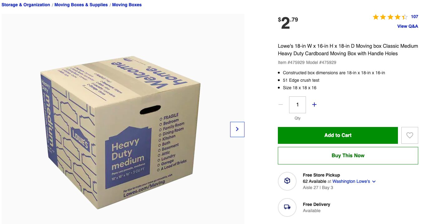 我们建议如果附近有Home Depot或者Lowe’s 门店,选择线上下单门店取货最便捷,避免前往门店后发现合适尺寸的纸箱无货情况白跑一趟;如果更希望纸箱直接邮寄到家,建议可以对比两家哪家支持你地址的Ship to Home选项(视不同地址 情况会有所差异)。