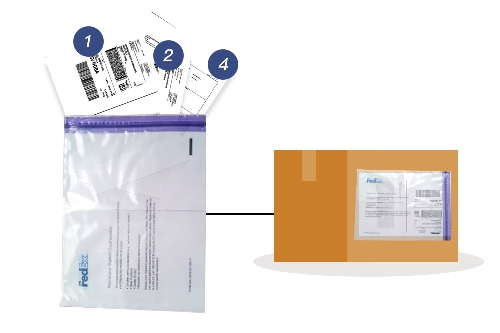 6、按上图示例将【1张包裹主运单】、【3张AWB运单】、【3份物品详情报关单】装入FedEx报关袋中,并将报关袋贴于主包裹上。